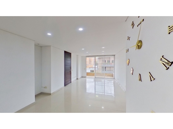 El apartamento está en un segundo piso, con un área de 111 m2, consta de sala comedor, balcón con vista exterior, biblioteca, cocina integral independiente, zona de lavandería, red de gas, calentador. Son 3 habitaciones, la principal con vestier, closet adicional y baño, las otras 2 alcobas con closet. Más alcoba de servicio con espacio para baño (se puede volver a instalar). Tiene 2 parqueaderos propios cubiertos y un cuarto útil.
